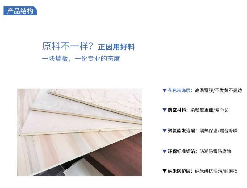 室內(nèi)墻板,無甲醛,無異味,具有防潮防霉、阻燃防火、強度高韌度性好、不易老化,易于清理等特點,裝修速度快,產(chǎn)品長度可在運輸方便的情況下任意定制、即裝即住一步到位,省時省工。外墻板,采用環(huán)保型基材,中間基層是復(fù)合經(jīng)阻燃處理的保溫隔熱材料,底層是起到防潮作用的保護(hù)層,具有保溫隔熱、防水阻燃、輕質(zhì)抗震、施工便捷、隔音降噪、綠色環(huán)保、色彩豐富等特點。