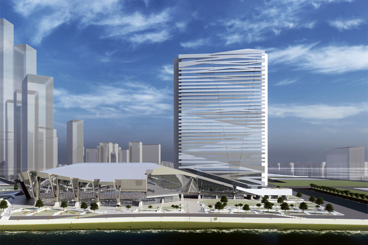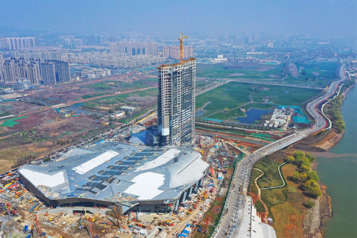 南京揚子江國際會議中心工程建筑面積18.73萬平方米,主要由會展區(qū)、會議區(qū)、辦公區(qū)和酒店區(qū)四部分組成,總用鋼量為 4.6萬噸。本項目承建地下室和酒店區(qū)鋼結(jié)構(gòu),酒店區(qū)為 “鋼框架+鋼支撐”結(jié)構(gòu)體系, 總用鋼量約1.6萬噸,其中酒店區(qū)共35層,面積約5.1萬㎡,建筑高度157m, 平面長寬比為6.6、 高寬比為9.6,超限接近極值,如此復(fù)雜的結(jié)構(gòu)在 國內(nèi)屈指可數(shù)。