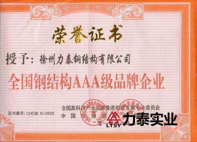 榮譽證書:全國鋼結(jié)構(gòu)AAA級品牌企業(yè)