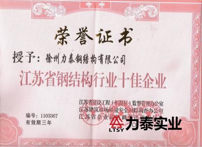 榮譽證書:江蘇省鋼結(jié)構(gòu)十佳企業(yè)